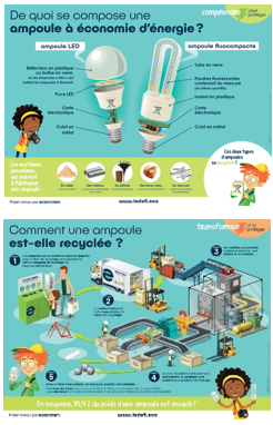 Format 60*80 cm / recto-versoRecto : les matériaux qui composent les lampesVerso : le process de dépollution et de recyclage