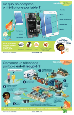 Format 60*80 cm / recto-versoRecto : les matériaux qui composent les téléphones portablesVerso : le process de dépollution et de recyclage