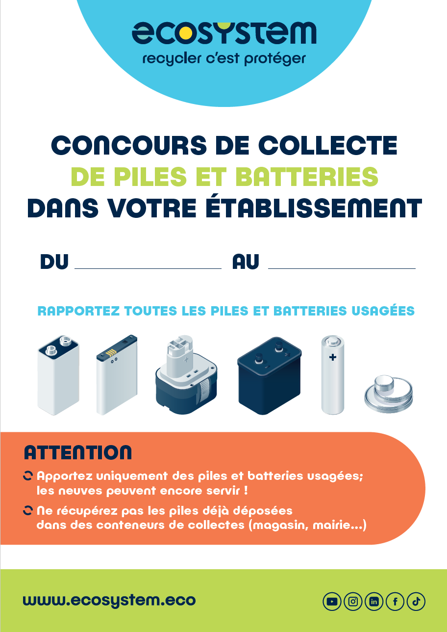 Affiche destinée à informer les parents (ou les jeunes) qu'un concours de collecte de piles est organisé dans l'établissement.Format A3